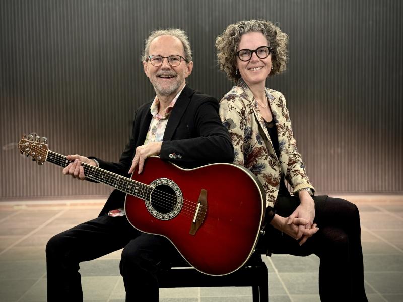 Biblioteksmusikant Peter Elmelund har taget guitaren med og står for foredragets fællessange med tekster af H.C. Andersen.